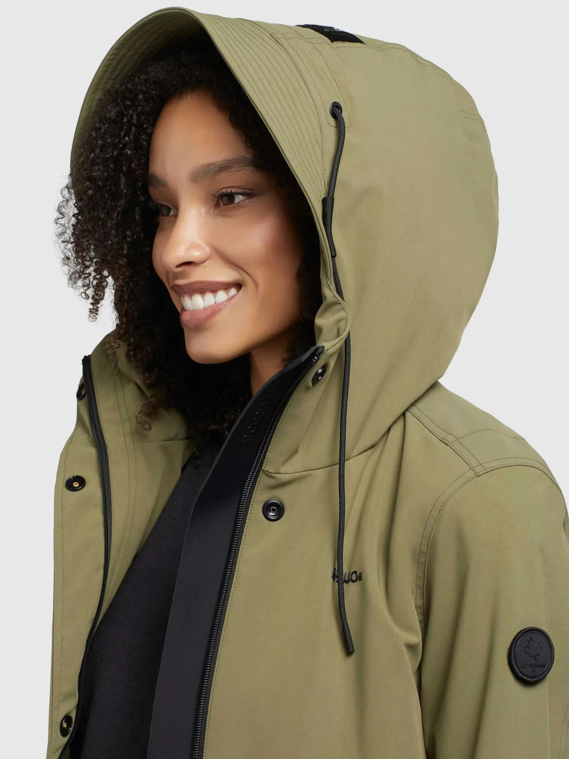 – hoch schließende Kapuze mit Kordelzug